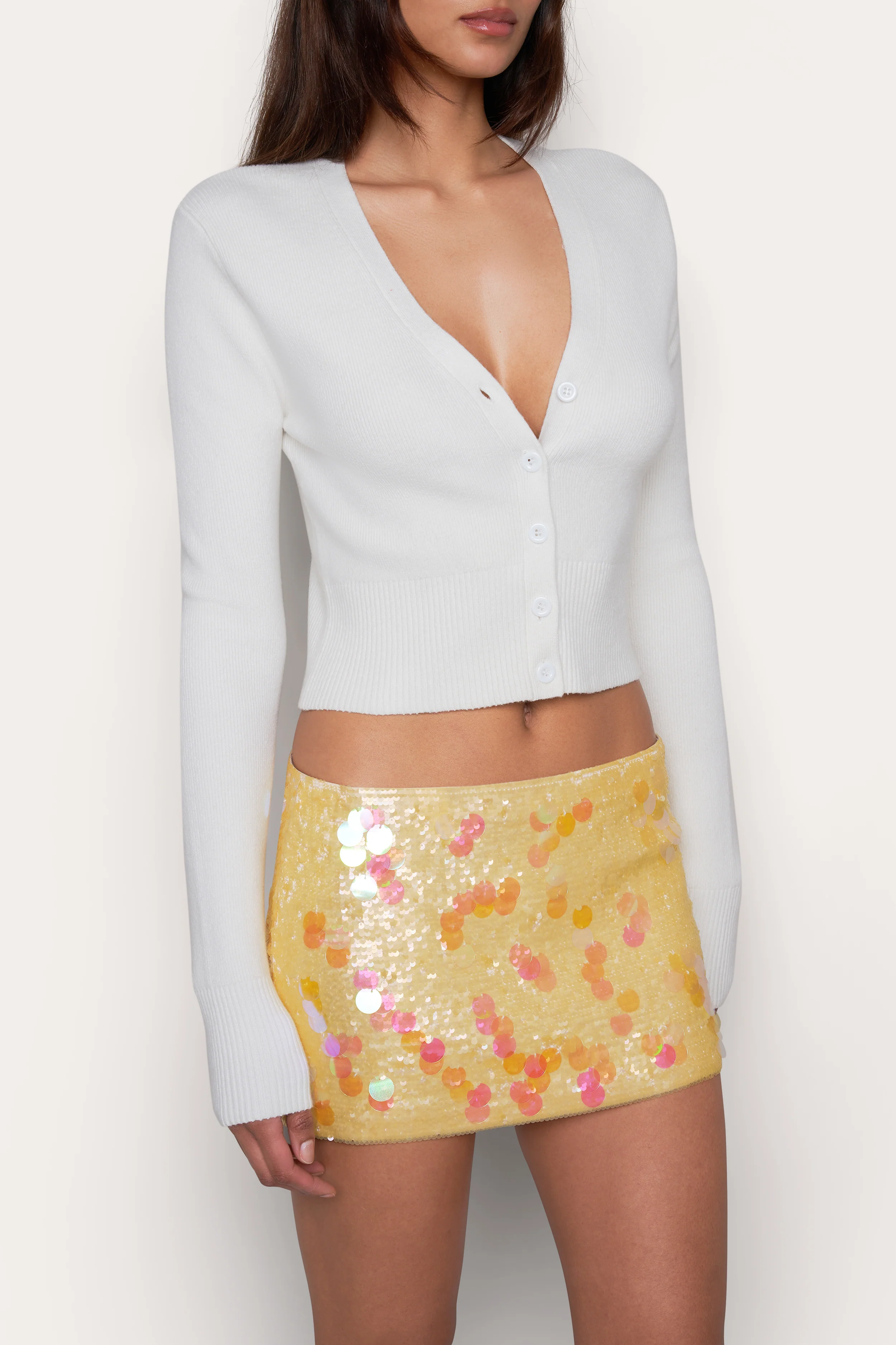 - Button-down cardigan that sits right above the hip.